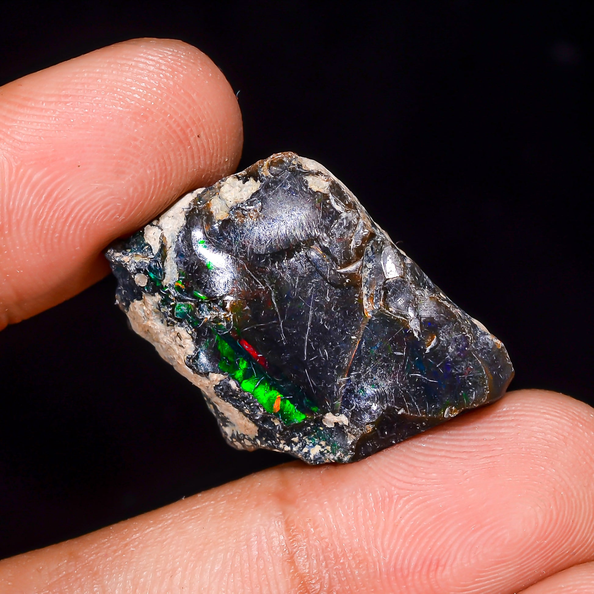 "Behold the mesmerizing depths of this Very High Quality Natural Black Ethiopian Opal Rough! This exceptional Welo opal boasts a deep, naturally enhanced dark body tone that serves as the perfect canvas for an incredible intensity of multi-fire play of color, truly making it a standout gem, just as it was unearthed."