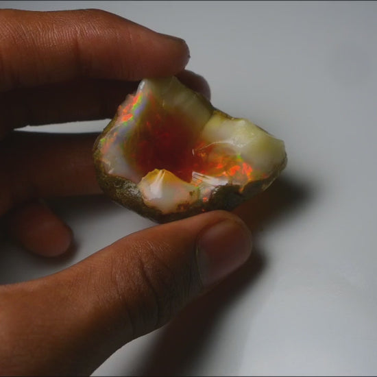 We are thrilled to present this magnificent Large 92.05 Carat Multi-Fire Natural Ethiopian Welo Opal ROUGH SPECIMEN for direct purchase! Sourced directly from the famous Welo mines of Ethiopia, this substantial piece is a captivating natural wonder, perfectly suited for the discerning collector, mineral enthusiast, or as a stunning display piece