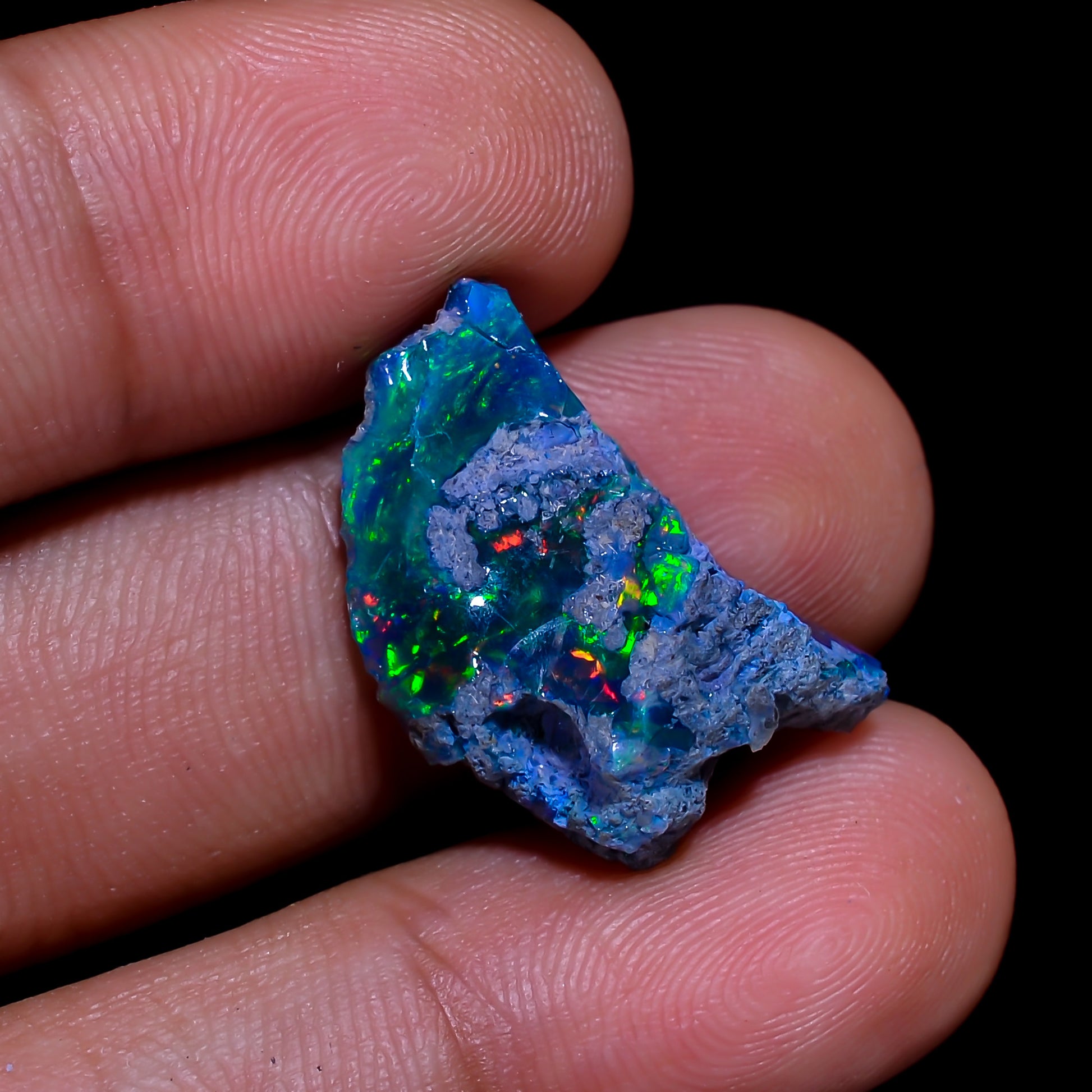 "Behold the mesmerizing depths of this Very High Quality Natural Black Ethiopian Opal Rough! This exceptional Welo opal boasts a deep, naturally enhanced dark body tone that serves as the perfect canvas for an incredible intensity of multi-fire play of color, truly making it a standout gem, just as it was unearthed."