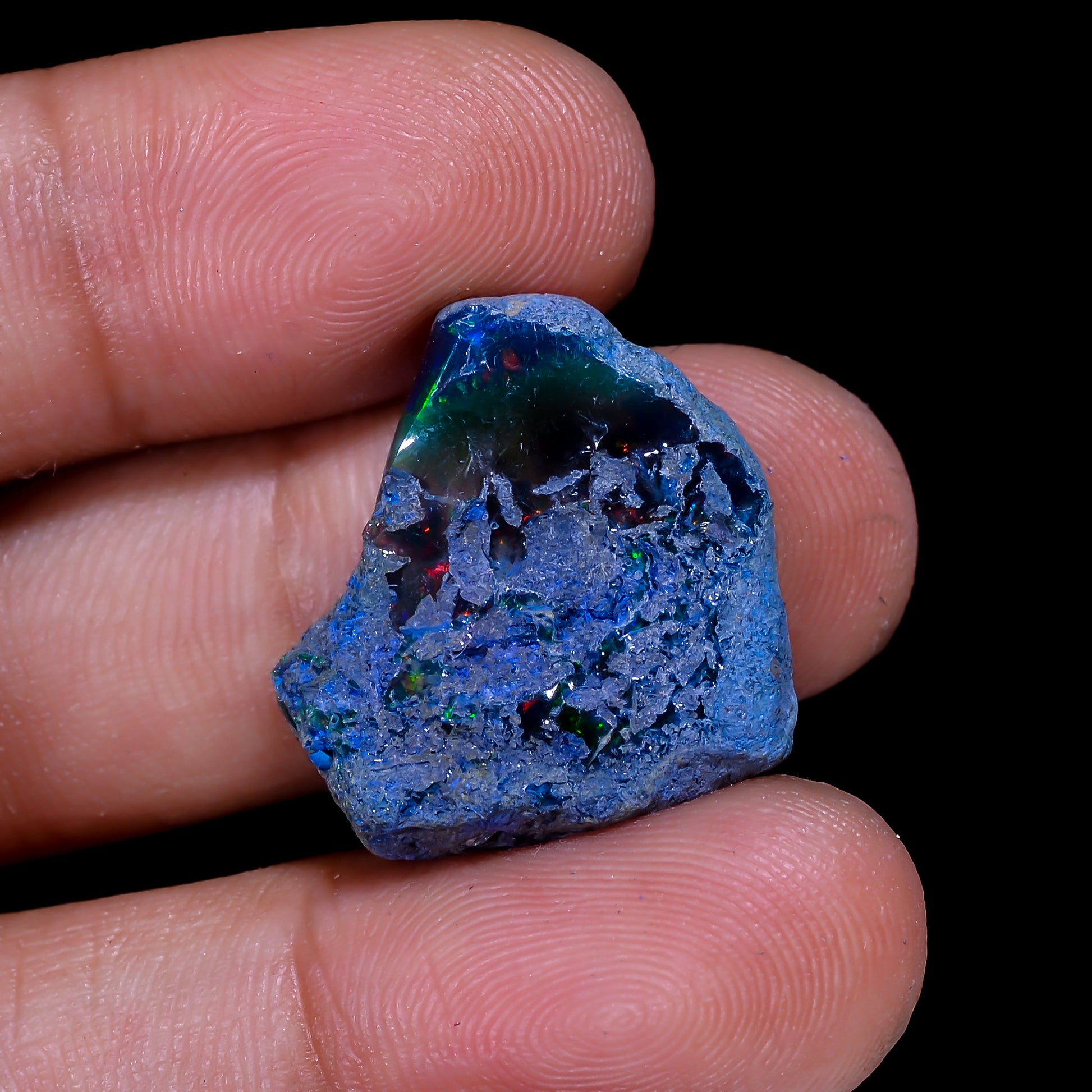 Intense Multi-Fire Play of Color: Prepare to be captivated by the dazzling flashes of fiery reds, brilliant greens, electric blues, and golden oranges dancing across its rough surface. The dark background makes the spectral colors pop with stunning contrast.