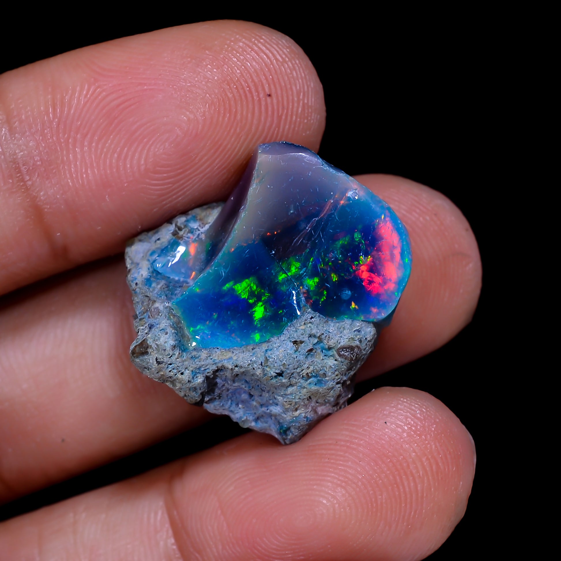 "Behold the mesmerizing depths of this Very High Quality Natural Black Ethiopian Opal Rough! This exceptional Welo opal boasts a deep, naturally enhanced dark body tone that serves as the perfect canvas for an incredible intensity of multi-fire play of color, truly making it a standout gem, just as it was unearthed."
