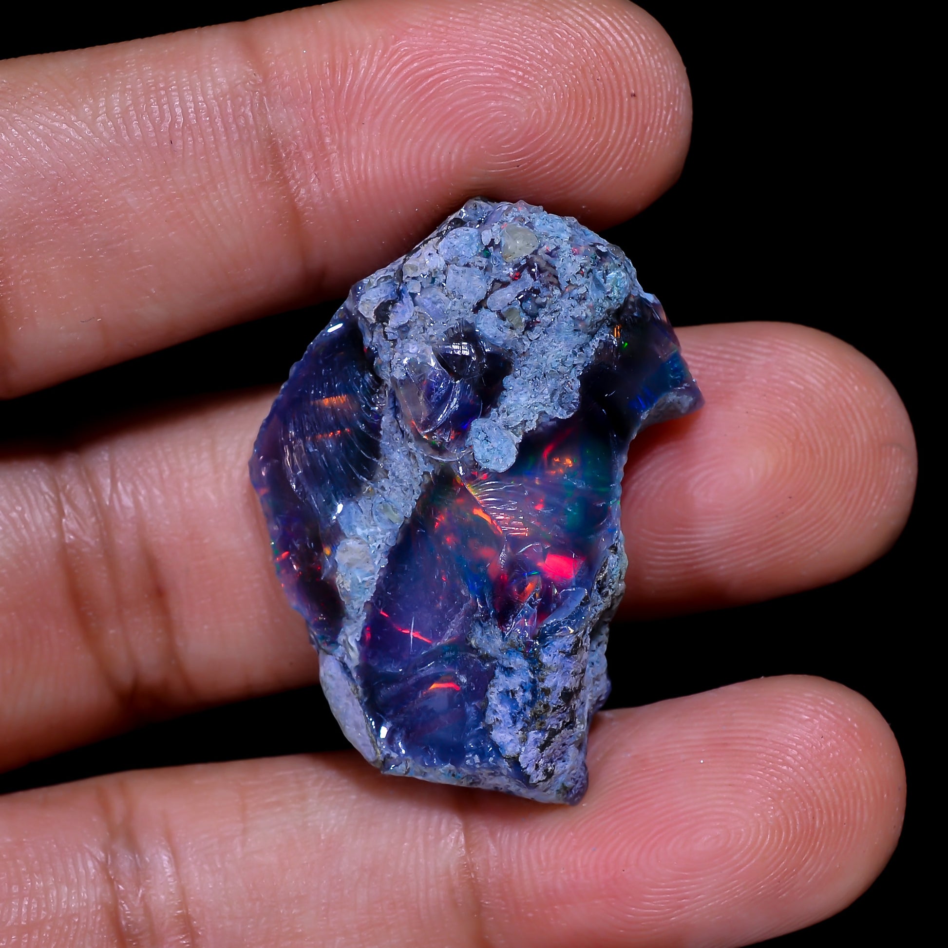 "Behold the mesmerizing depths of this Very High Quality Natural Black Ethiopian Opal Rough! This exceptional Welo opal boasts a deep, naturally enhanced dark body tone that serves as the perfect canvas for an incredible intensity of multi-fire play of color, truly making it a standout gem, just as it was unearthed."