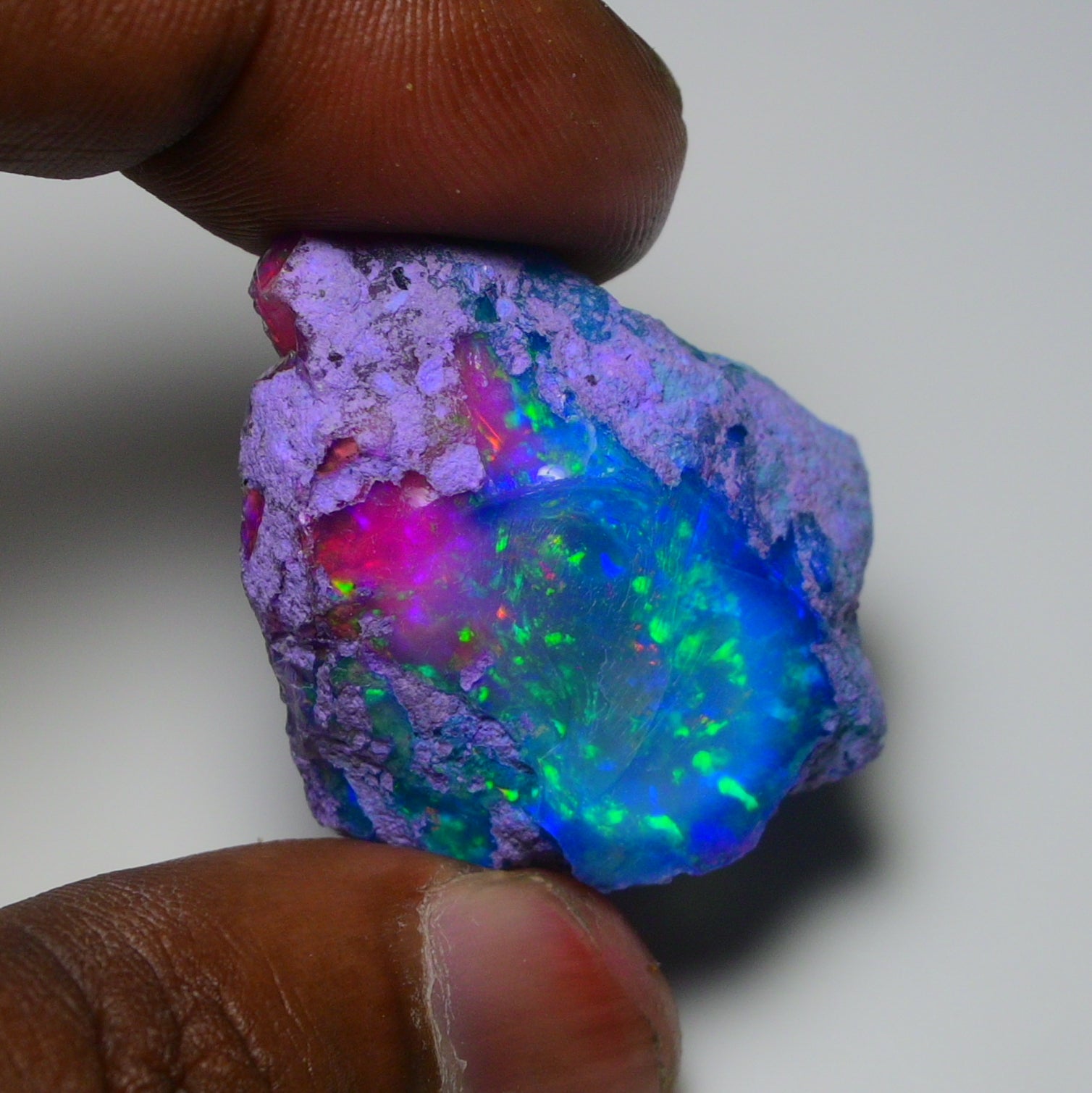 "Behold the mesmerizing depths of this Very High Quality Natural Bio Color Ethiopian Opal Rough! This exceptional Welo opal boasts a deep, naturally enhanced dark body tone that serves as the perfect canvas for an incredible intensity of multi-fire play of color, truly making it a standout gem, just as it was unearthed."